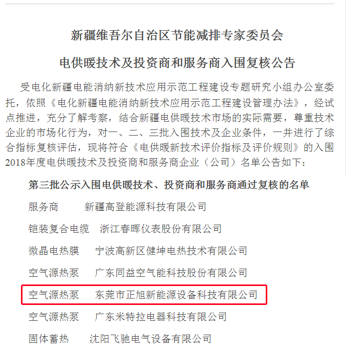 《電化新疆電能消納新技術應用示范工程建設管理辦法》經試點推進,充分了解考察,結合新疆電供暖技術市場的實質需要,成功入圍東莞熱泵廠家-東莞市正旭新能源設備科技有限公司為《空氣源熱泵》新疆電供暖技術及投資商和服務商第三批,并復核公告。 ...