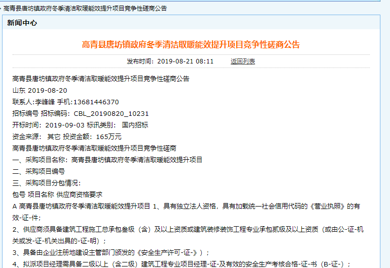 【公告】2019年高青縣唐坊鎮(zhèn)政府冬季清潔取暖能效提升項(xiàng)目