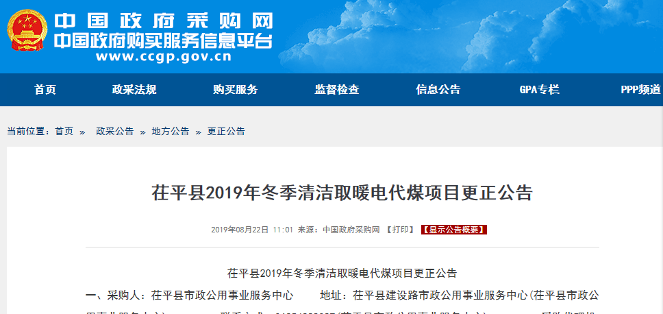 【更正公告】茌平縣2019年冬季清潔取暖電代煤項(xiàng)目