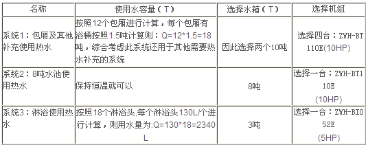 本系統設計主機為4臺ZWH-BT110E,末端供水采用循環式供水,當管路內水溫低于設定溫度時 管路中感溫頭傳送信號 增壓水泵及回水管上的電磁閥打開 機組及循環水泵開始運行加熱,這樣可以保證使用熱水末端隨時都可以用到熱水;