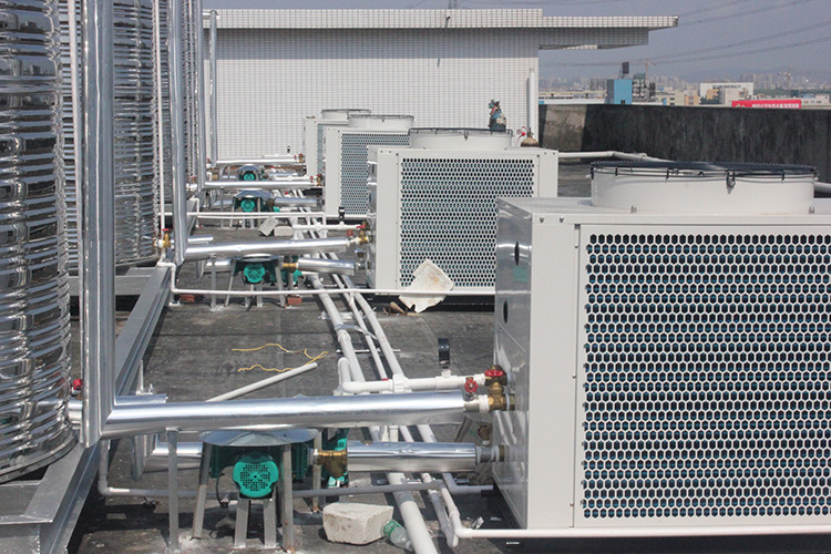 水箱和機組安裝在樓頂,冷熱水管在路面與客戶水管對接。熱泵熱水系統(tǒng)主要由熱泵熱水機組,不銹鋼保溫水箱、循環(huán)系統(tǒng)、補水系統(tǒng)、控制系統(tǒng)和管道配件組成。主機安裝正旭熱水機組,儲熱水箱連接熱水管路通向各個用水點。其采用強制循環(huán)定溫放水,熱水箱儲水方式,運行穩(wěn)定。同時,整個系統(tǒng)控制采用智能化控制,24小時準確進行水溫、水位檢測,保證系統(tǒng)安全穩(wěn)定運行,實現(xiàn)無人管理。