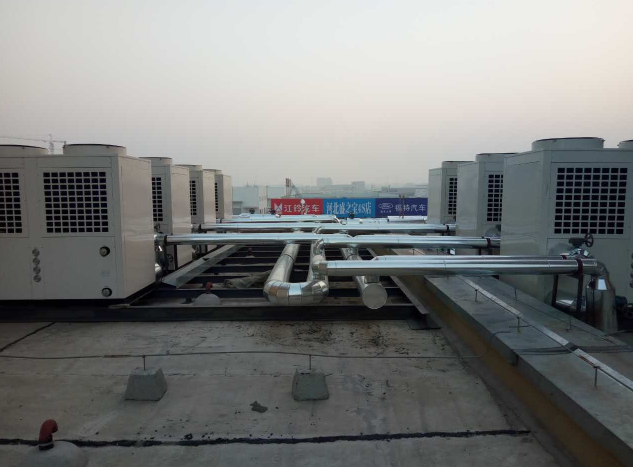 熱泵主機噪音主要包括空氣動力性噪音、管道噪音以及機械噪音等,為了減少主機噪音,可以根據(jù)熱泵主機的重量選擇槽鋼或者工字鋼的型號,盡量選擇建筑物的一個角,進行平臺焊接,將平臺的支撐點放在建筑物的立柱上。對于一般的工程來說,建筑物+5厘米橡膠減震墊+型鋼平臺+5厘米橡膠減震墊+熱泵主機,就可以達到減振要求。