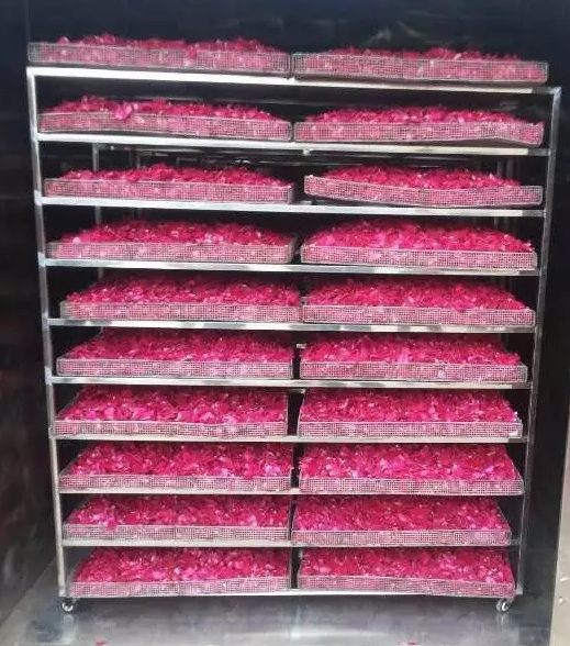 將挑選好的玫瑰花蕾均勻的擺放在有鐵絲網(wǎng)底的烘干箅內,分層放置,每層鮮花擺放厚度不得超過10厘米,花瓣統(tǒng)一向下或向上,厚度一致,勿擠壓。注意將擺滿花蕾的烘干箅裝車入房時要輕裝輕放,花蕾不能變形、磨損。