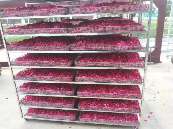 如果是烘干玫瑰花瓣,在玫瑰花盛開之后采摘即可。如果烘干的是玫瑰花蕾,需在花蕾剛剛散而未開的時候采收最好,采的太遲的話,恐防花蕾在烘干過程中花瓣散落。烘干的玫瑰花花蕾選用12小時內采摘的新鮮花蕾為佳,色澤鮮艷,花朵大小均勻,弱小花蕾少于5%;蕾托完整,無花柄,無雜質,無蟲蝕,無人為灑水,使水現(xiàn)象;無異味,香味純正;無半開花蕾,無開放花朵。分批次采摘的玫瑰花,不能一下就送入烘干房,烘干之前大量花蕾應進行攤晾以防發(fā)熱,然后準備好分批次、裝盤上車、入房。