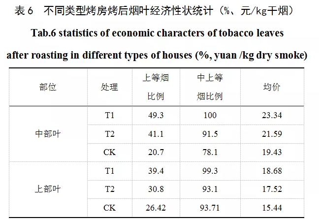 從表6可以看出,處理T1烤后煙葉的上等煙葉比例、中上等煙葉比例和均價最高,對照最低,處理T2除上部葉中上等煙比例比對照CK略低,其余指標均高于對照CK,低于處理T1。其中處理T1中部葉分別比對照提高了28.6%、21.9%和3.91元/kg干煙,比處理T2提高了8.2%、8.5%和1.75元/kg干煙;上部葉葉分別比對照提高了12.98%、5.59%和3.24元/kg干煙,比處理T2提高了8.6%、6.2%和1.16元/kg干煙。