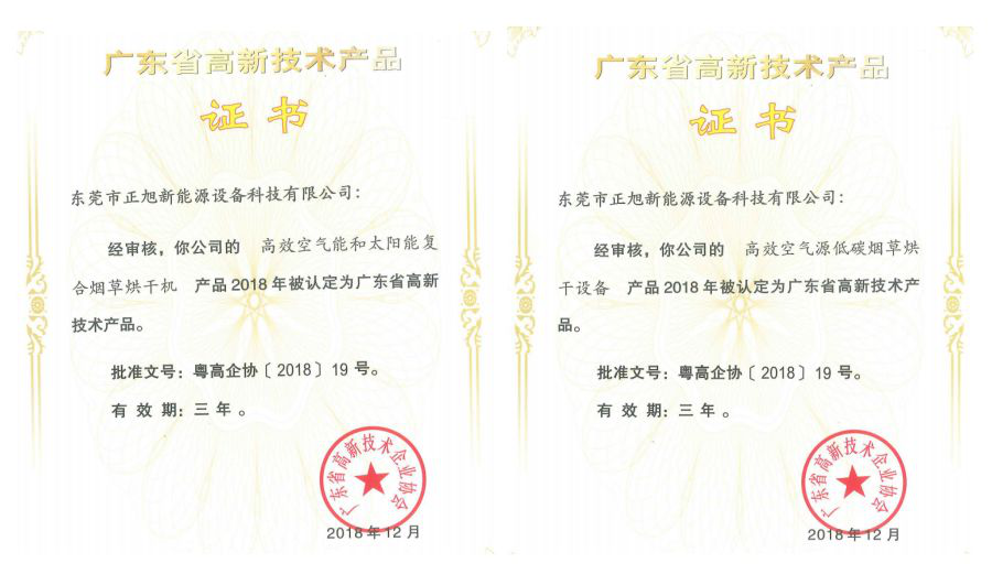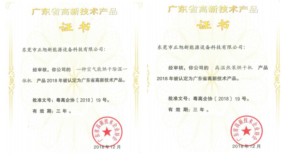在過去的2018年,正旭熱泵烘干榮獲廣東省高新技術企業協會頒發的13項高新技術產品證書。正旭在熱泵烘干領域中的努力,得到了高新技術協會的充分肯定。13項高新技術產品證書包括空氣能烘干除濕一體機、熱泵冗余控制系統、高溫熱泵烘干機、多功能微型烘干機、分體式熱回收型熱泵烤房等等。