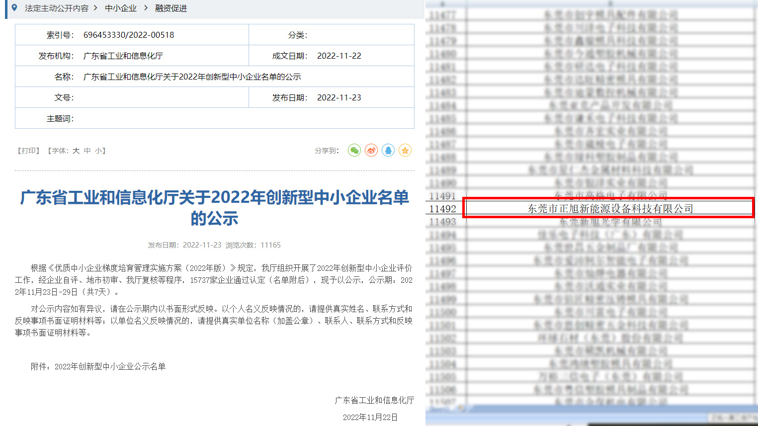 11月24日,廣東省工業(yè)和信息化廳官網(wǎng)發(fā)布了《關(guān)于2022年創(chuàng)新型中小企業(yè)名單的公示》,東莞市正旭新能源設(shè)備科技有限公司榮登其中。作為最早一批生產(chǎn)空氣源熱泵的制造業(yè)企業(yè),正旭多年來(lái)在熱泵行業(yè)的專(zhuān)注和創(chuàng)新有目共睹,此次入圍“2022創(chuàng)新型中小企業(yè)”公示名單,也算實(shí)至名歸、值得慶賀!
