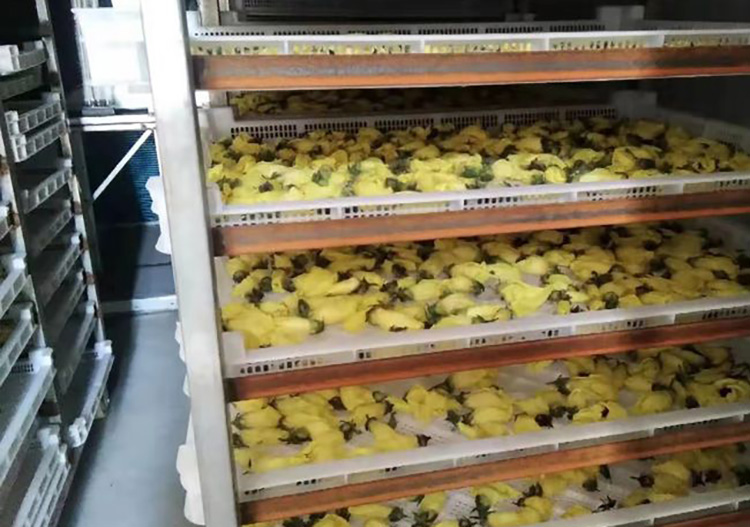2. 一般農(nóng)戶選擇用炒鍋高溫殺青,此時(shí)我們選擇用烘干機(jī)殺青,更能保持金花葵原本的香氣。殺青是一個(gè)重要環(huán)節(jié),一方面可以高溫滅菌,另一方面可以保留原本香氣,形成良好的的色澤;