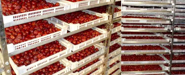 1. 烘房緩慢升溫,讓鮮棗緩慢適應升溫過程,使鮮棗在35攝氏度時烘干8小時,然后緩慢升溫至45攝氏度,持續7-8小時后,用力按壓棗果時棗身會出現皺紋;