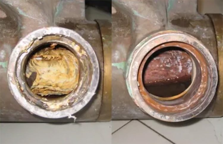 熱泵系統(tǒng)在制熱過程中,隨著熱水不斷蒸發(fā)和濃縮,水中鈣鎂離子會(huì)發(fā)生化學(xué)反應(yīng),產(chǎn)生難溶性固體沉淀物質(zhì),并粘附在換熱器管壁、熱水管道內(nèi)壁、水箱內(nèi)膽等位置,形成阻礙熱傳遞的“水垢”。由此可知水垢形成的兩個(gè)條件,一是水溫達(dá)到水垢生成的臨界點(diǎn)60℃以上,二是水質(zhì)差、含鈣、鎂離子等重金屬離子較多。