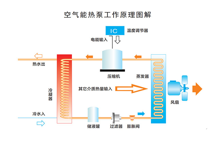 空氣能熱泵是按照“逆卡諾”原理工作的,逆卡諾循環原理。通過壓縮機系統運轉工作,吸收空氣中熱量制造熱水。具體過程是:壓縮機將冷媒壓縮,壓縮后溫度升高地冷媒,經過水箱中的冷凝器制造熱水,熱交換后的冷媒回到壓縮機進行下一循環,在這一過程中,空氣熱量通過蒸發器被吸收導入冷媒中,冷媒再導入水中,產生熱水。