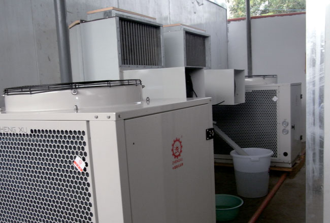 利用壓縮機做工帶動冷凝器加熱,再利用循環風機把熱風吹散到物料,物料里的水分接觸熱風后成為水蒸氣,水蒸氣吸入主機蒸飯器后冷凝成水后流出。從熱達到烘干的效果。由于是壓縮機做工加熱,不吸收空氣中的熱量。所以外界環境溫度低對機器能效沒有影響。
